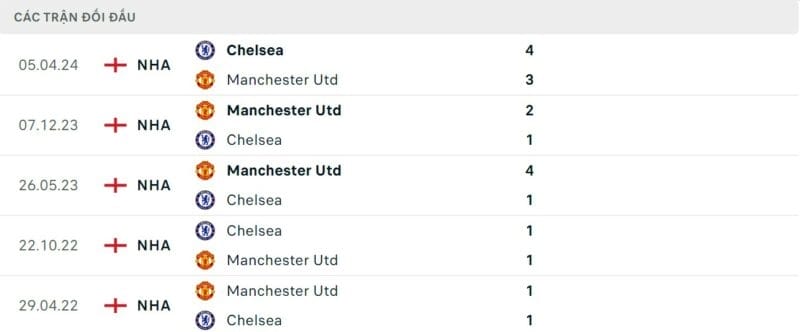 Kết quả các trận đấu gần đây giữa Man United vs Chelsea