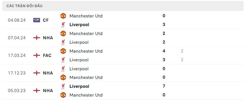 Kết quả đối đầu các trận gần đây nhất của Man United vs Liverpool