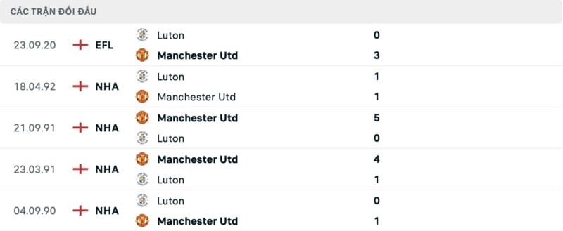 Thành tích đối đầu MU vs Luton