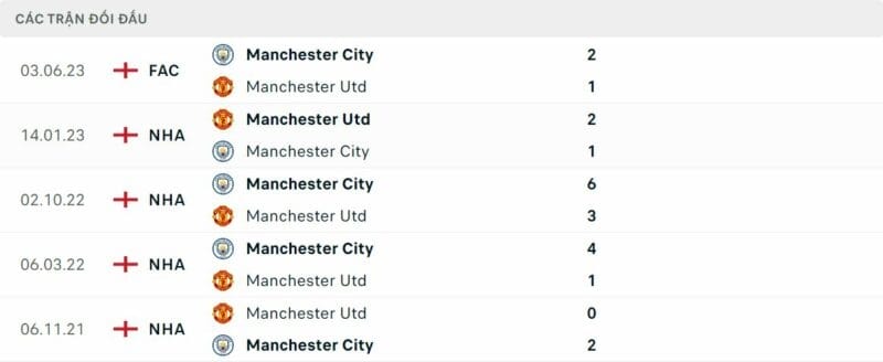 Thành tích đối đầu MU vs Man City: