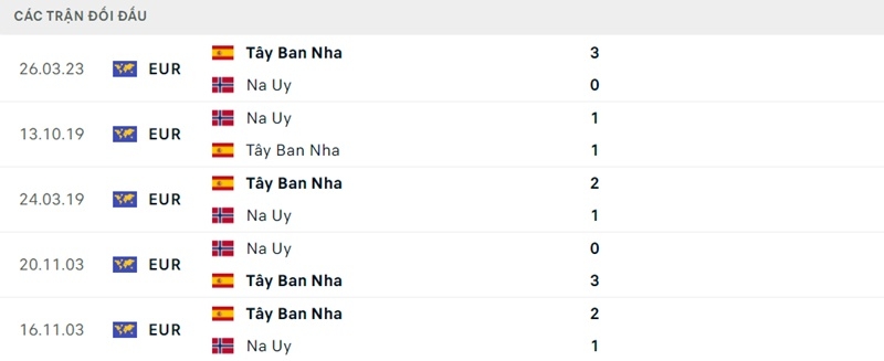Thông tin đối đầu Na Uy vs Tây Ban Nha: