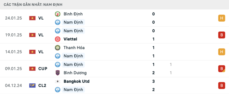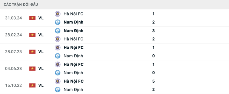 Kết quả đối đầu các trận gần đây nhất của Nam Định vs Hà Nội