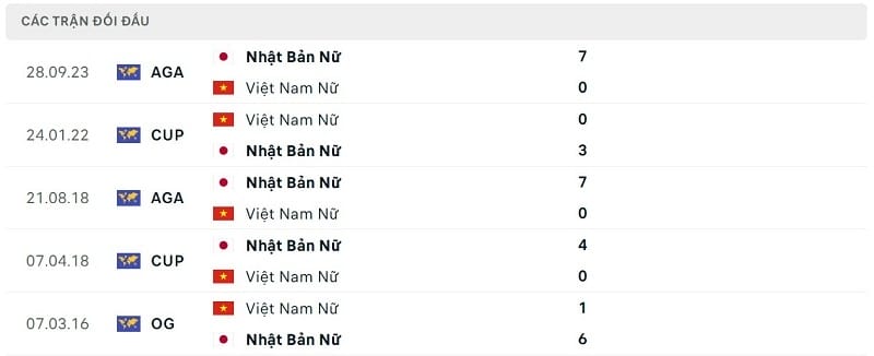 Thành tích đối đầu nữ Nhật Bản vs nữ Việt Nam: