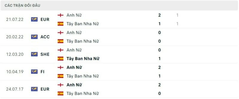 Thành tích đối đầu nữ Tây Ban Nha vs nữ Anh: