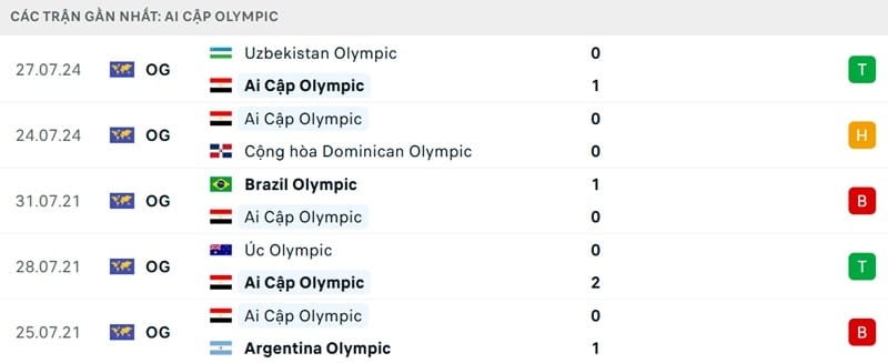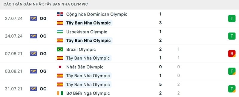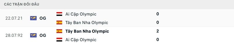 Kết quả đối đầu các trận gần đây nhất của Olympic Tây Ban Nha vs Olympic Ai Cập