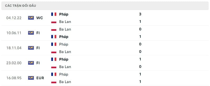 Kết quả đối đầu các trận gần đây nhất của Pháp vs Ba Lan