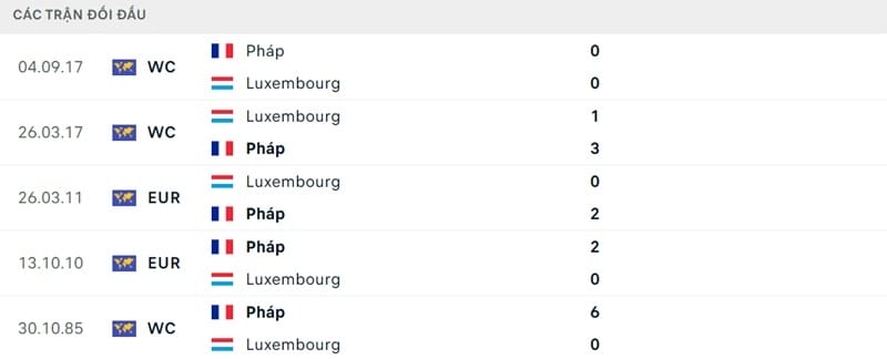 Thành tích đối đầu Pháp vs Luxembourg