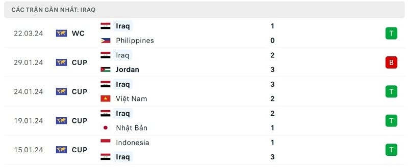 Phía bên kia chiến tuyến, trái ngược hoàn toàn với ĐT Philippines, Iraq chính là đội bóng được đánh giá cao nhất bảng F. Ở trận đấu gần nhất, ĐT Iraq đã đánh bại chính Philippines với tỷ số 1-0. Trước đó, Sư tử vùng Mesopotamia “hủy diệt” ĐT Indonesia 5-1 và giành chiến thắng trước Việt Nam với tỷ số 1-0.