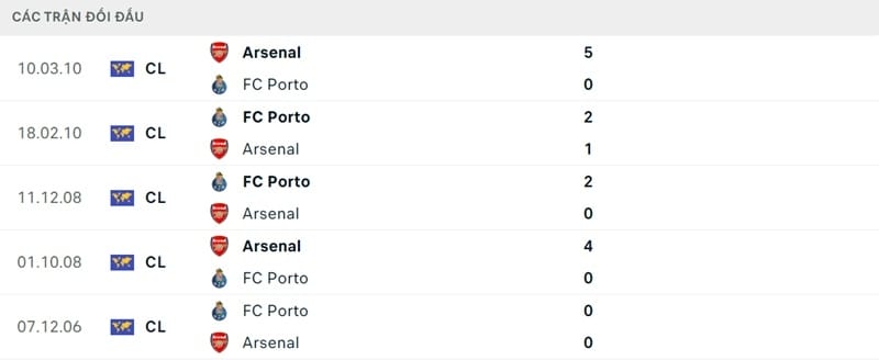 Thành tích đối đầu Porto vs Arsenal: