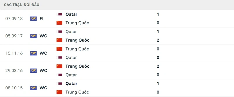 Thành tích đối đầu Qatar vs Trung Quốc: