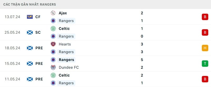 Rangers bắt đầu quá trình chuẩn bị cho mùa giải mới bằng trận thua 1-2 trước Ajax vào cuối tuần rồi. Đội bóng của Philippe Clement sẽ đụng độ Man United, Birmingham City và Union Berlin trong ba trận giao hữu cuối cùng của mùa hè, trước khi bước vào giải Ngoại hạng Scotland 2024/25 bằng việc chạm trán Hearts vào ngày 3 tháng 8.