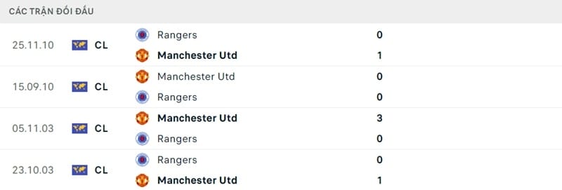 Kết quả đối đầu các trận gần đây nhất của Rangers vs Man Utd