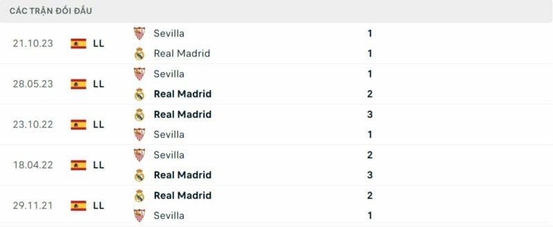 Thành tích đối đầu Real Madrid vs Sevilla: