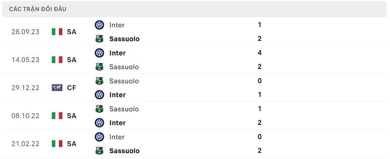 Thành tích đối đầu Sassuolo vs Inter Milan