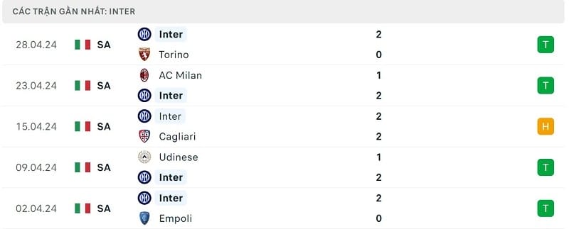 Phong độ gần đây Sassuolo vs Inter Milan