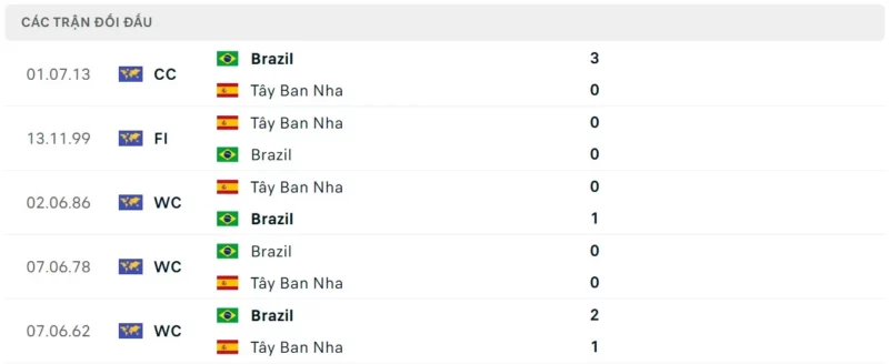 Thành tích đối đầu Tây Ban Nha vs Brazil