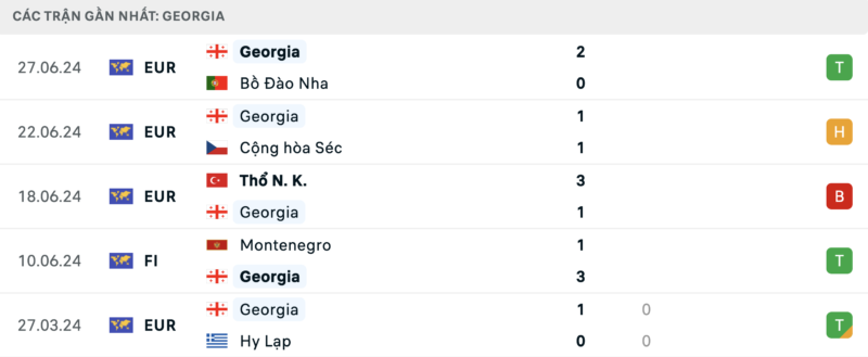 Georgia có bước chạy đà khá tốt trước thềm Euro 2024 với 3 chiến thắng liên tiếp. Trong lần đầu tiên tham dự một kỳ Euro, thành tích 1 thất bại, 1 trận hòa và 1 chiến thắng là kết quả có thể chấp nhận được.
