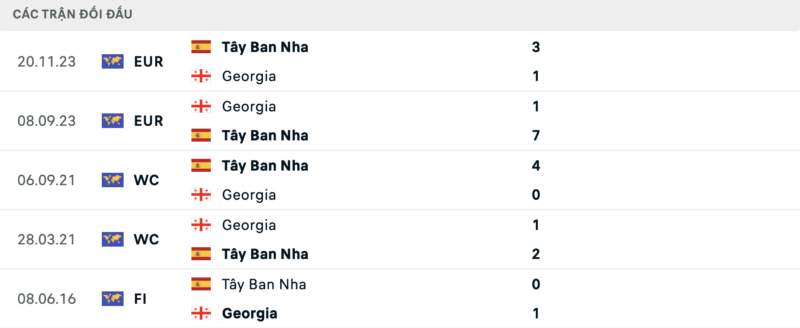 Kết quả đối đầu các trận gần đây nhất của Tây Ban Nha vs Georgia