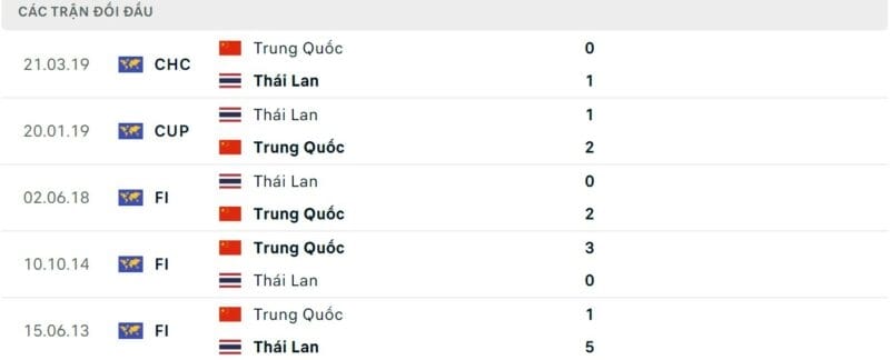 Thành tích đối đầu Thái Lan vs Trung Quốc: