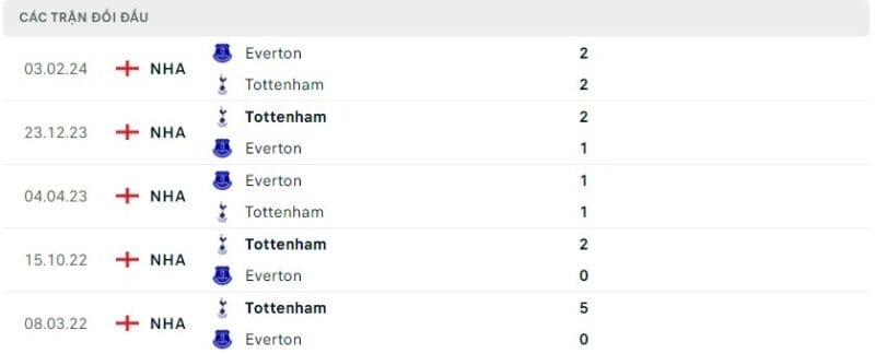 Kết quả các trận đấu gần đây giữa Tottenham vs Everton