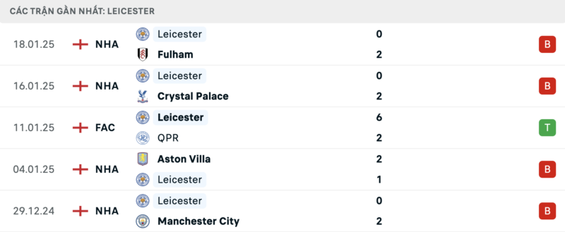 Leicester có phong độ rất tệ khi thua cả 7 trận gần nhất tại Ngoại hạng Anh.