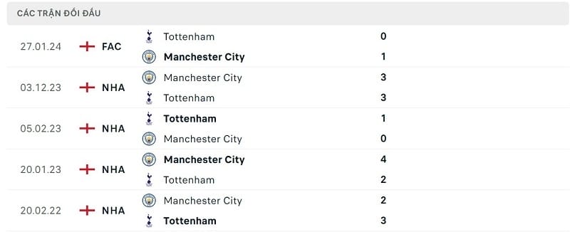 Thành tích đối đầu Tottenham vs Man City