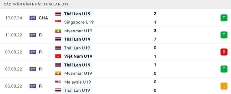 5 lần ra sân gần nhất, U19 Thái Lan thắng 3, hoà 1 và thua 1. Trong đó, Voi chiến từng nhận thất bại 0-1 trước U19 Việt Nam vào tháng 8/2022. Dù là nền quốc gia mạnh về bóng đá thuộc top đầu khu vực, nhưng lứa trẻ của Thái Lan thi đấu chưa thực sự thuyết phục.