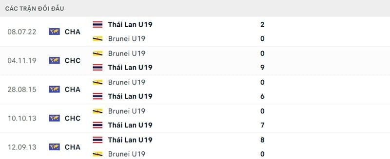 Kết quả đối đầu các trận gần đây nhất của U19 Brunei vs U19 Thái Lan