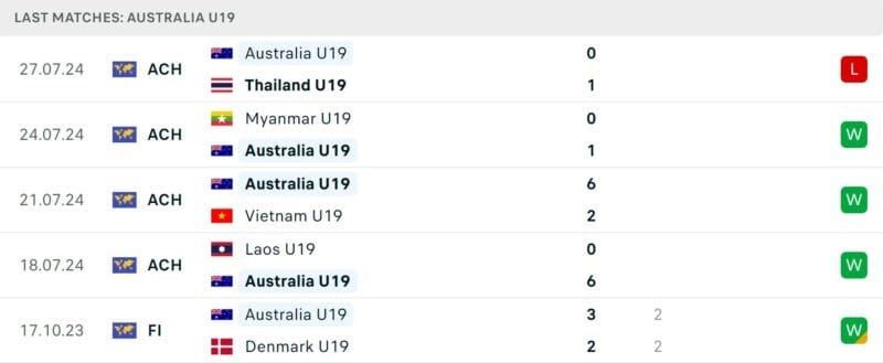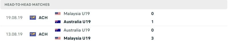 Kết quả những trận đối đầu gần đây giữa U19 Úc vs U19 Malaysia