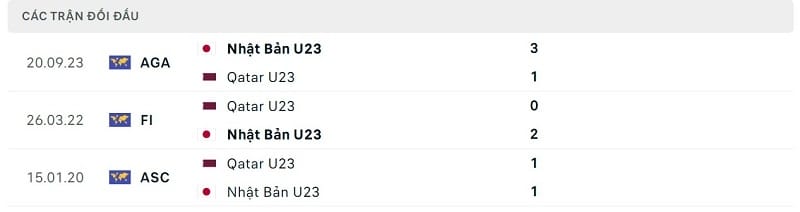 Thành tích đối đầu U23 Qatar vs U23 Nhật Bản