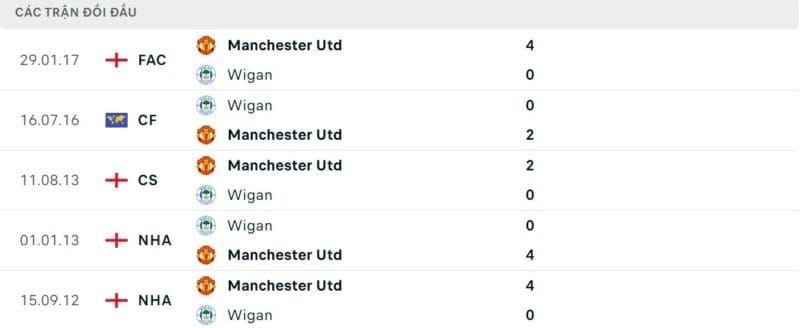 Thành tích đối đầu Wigan vs Man United: