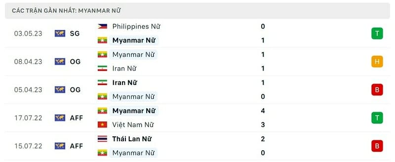Phong độ gần đây ĐT nữ Myanmar vs ĐT nữ Việt Nam: