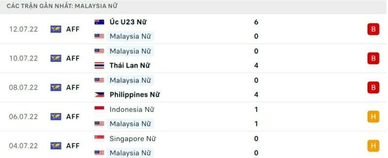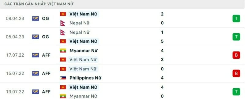 Phong độ gần đây ĐT nữ Việt Nam vs ĐT nữ Malaysia: