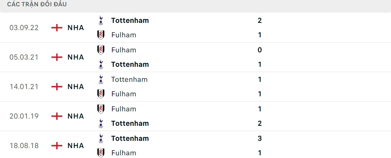 Thành tích đối đầu Fulham vs Tottenham: