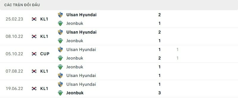 Thành tích đối đầu Jeonbuk vs Ulsan
