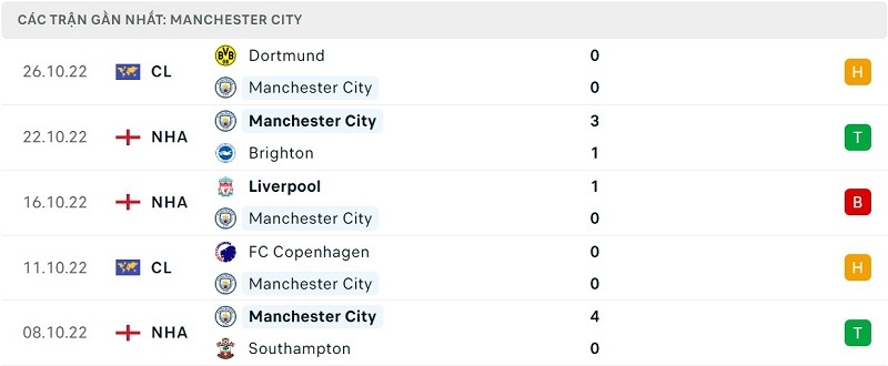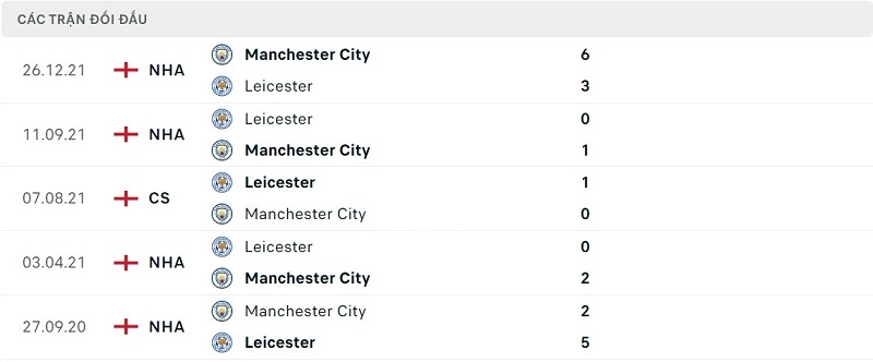 Thành tích đối đầu Leicester City vs Man City: