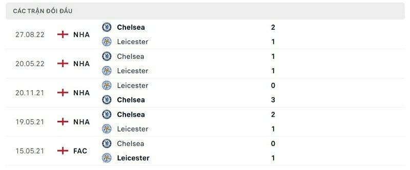 Thành tích đối đầu Leicester vs Chelsea:
