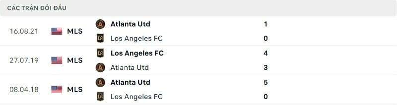 Thành tích đối đầu Los Angeles FC vs Atlanta United