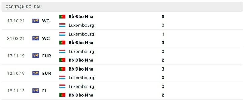 Thành tích đối đầu Luxembourg vs Bồ Đào Nha: