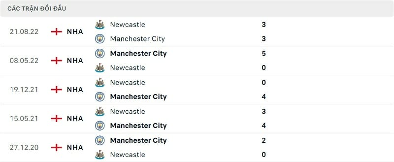 Thành tích đối đầu Man City vs Newcastle