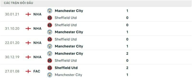 Thành tích đối đầu Man City vs Sheffield United: