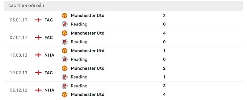 Thành tích đối đầu Man United vs Reading: