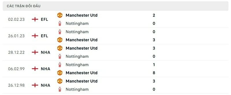 Thành tích đối đầu Nottingham Forest vs Man United: