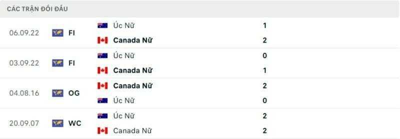 Thành tích đối đầu nữ Canada vs nữ Australia
