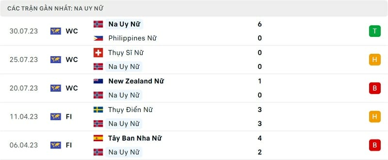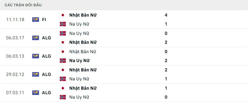 Thành tích đối đầu nữ Nhật Bản vs nữ Na Uy