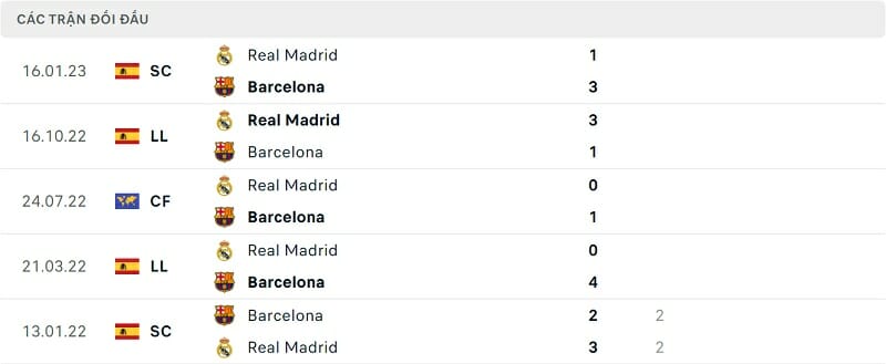 Thành tích đối đầu Real Madrid vs Barca