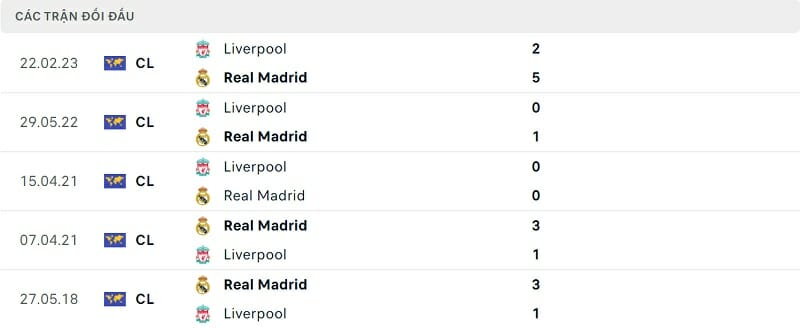Thành tích đối đầu Real Madrid vs Liverpool