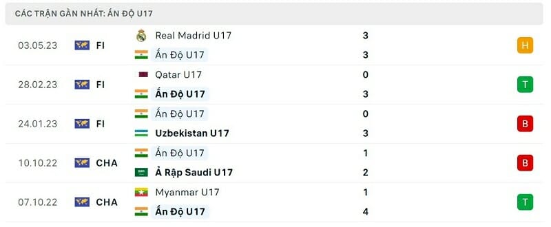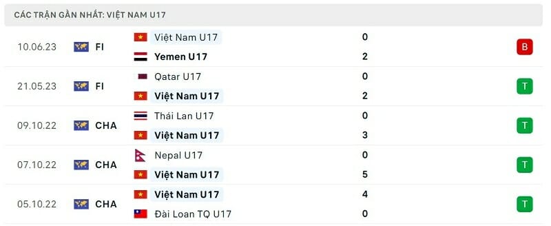 Phong độ gần đây U17 Việt Nam vs U17 Ấn Độ: