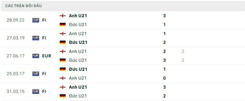 Thành tích đối đầu U21 Anh vs U21 Đức