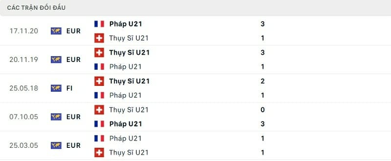 Thành tích đối đầu U21 Thụy Sĩ vs U21 Pháp